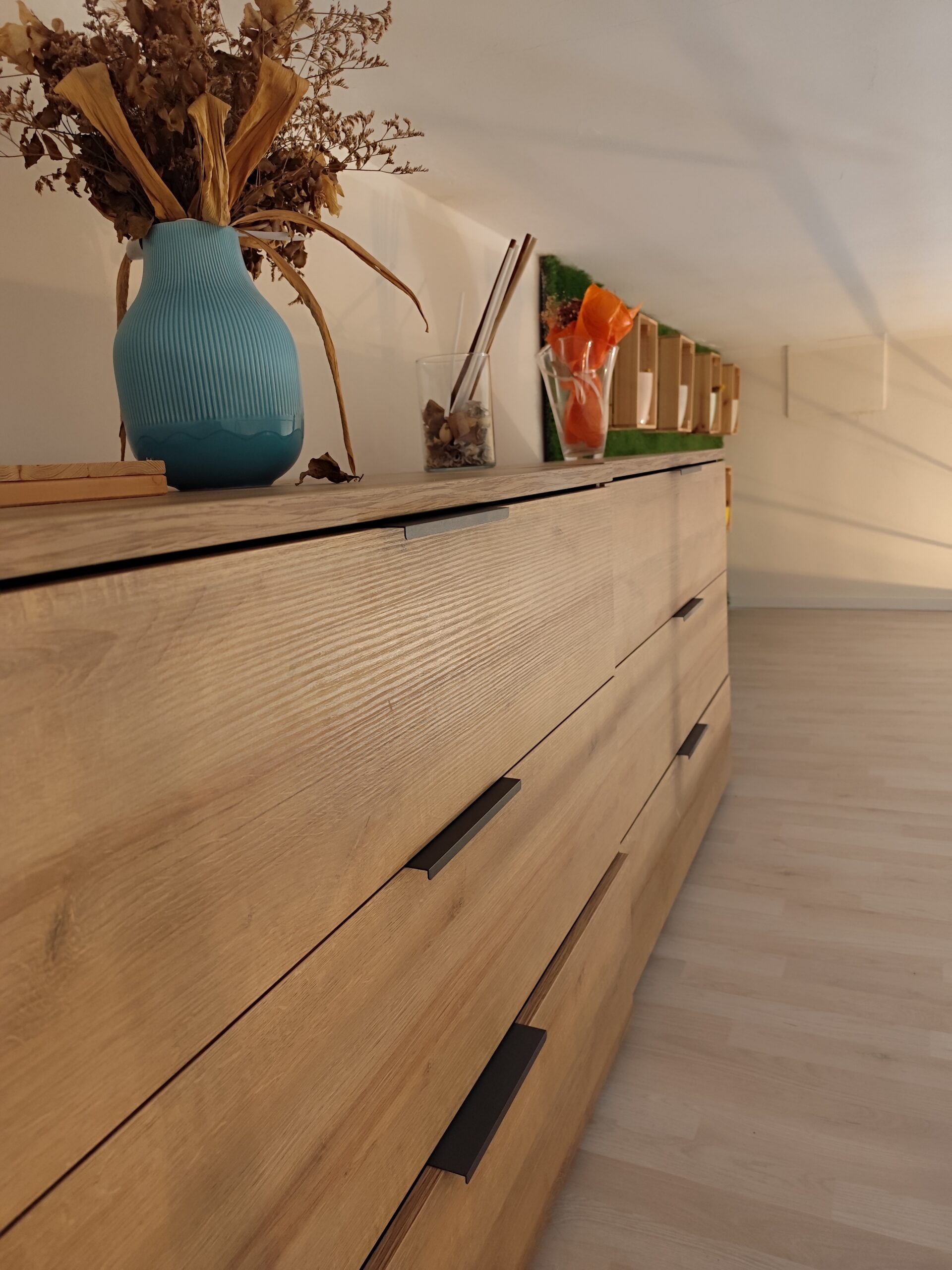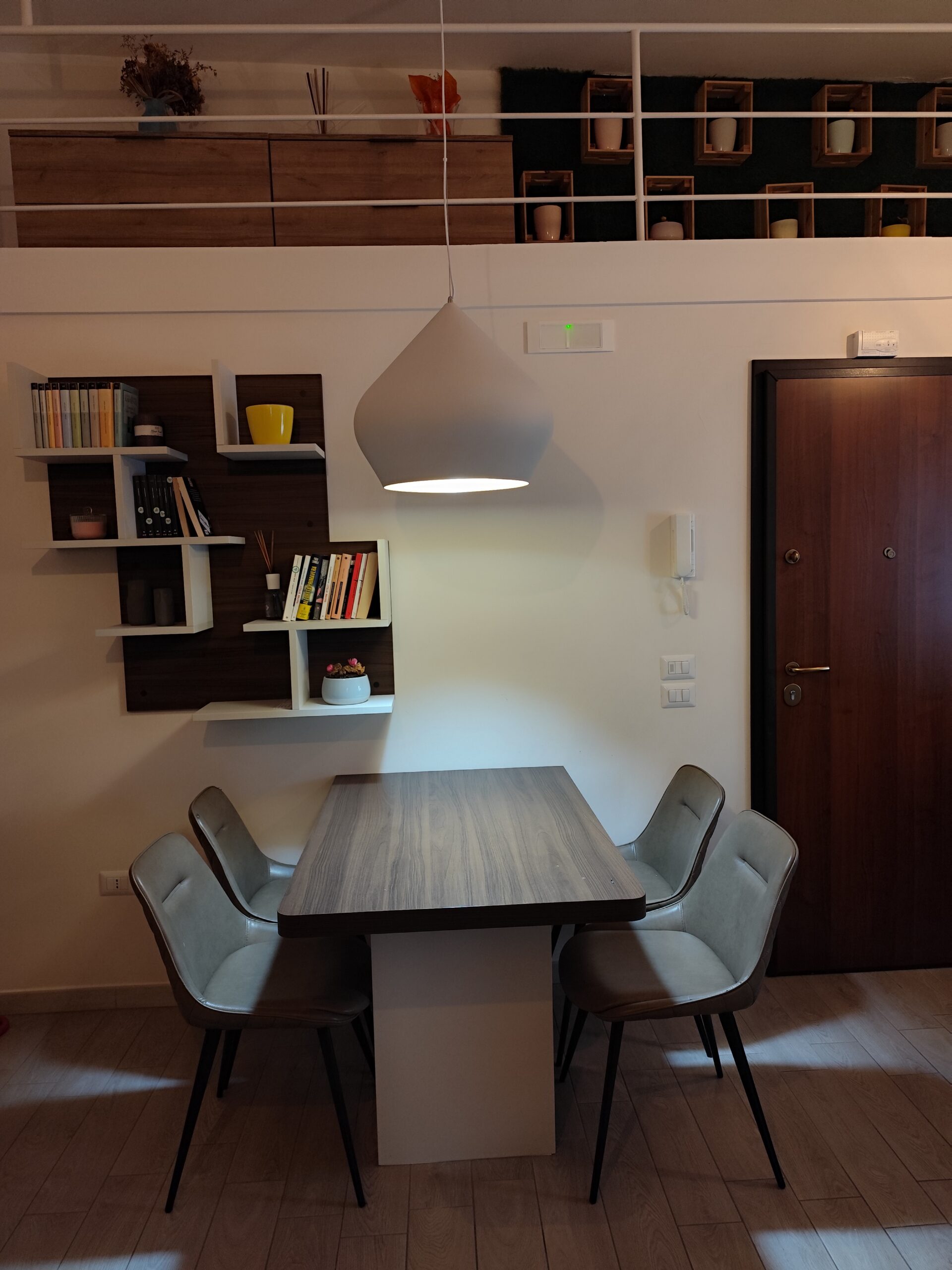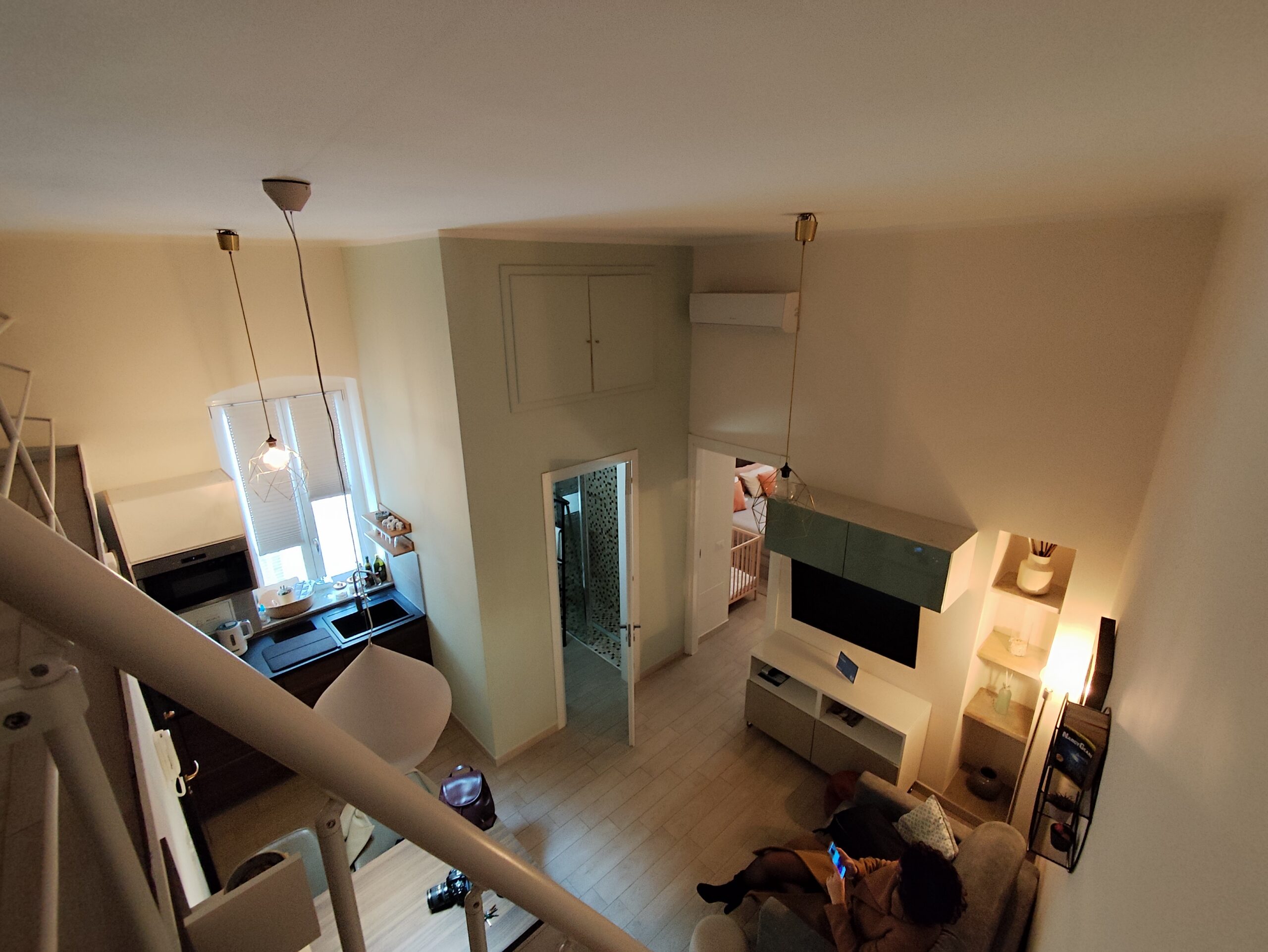 Loft di 70 mq con cucina attrezzata, zona living con soppalco, camera matrimoniale e bagno moderno. Arredi curati e funzionali.